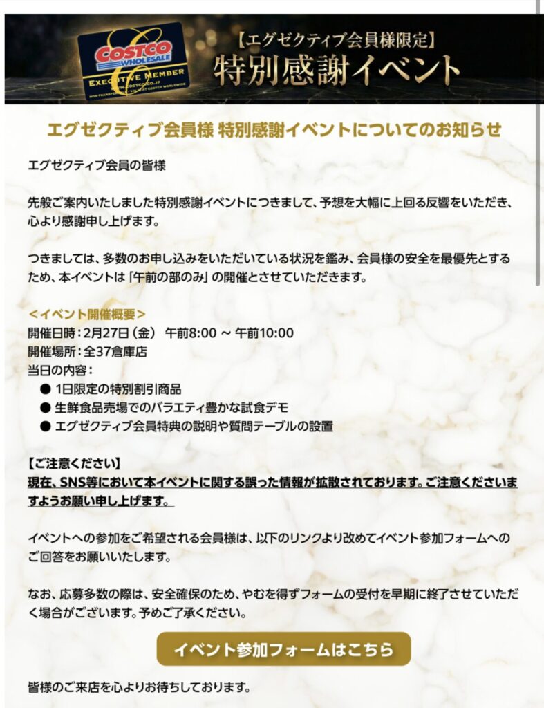コストコエグゼクティブ会員特別感謝イベント内容が公開も応募が多数で早期締め切り