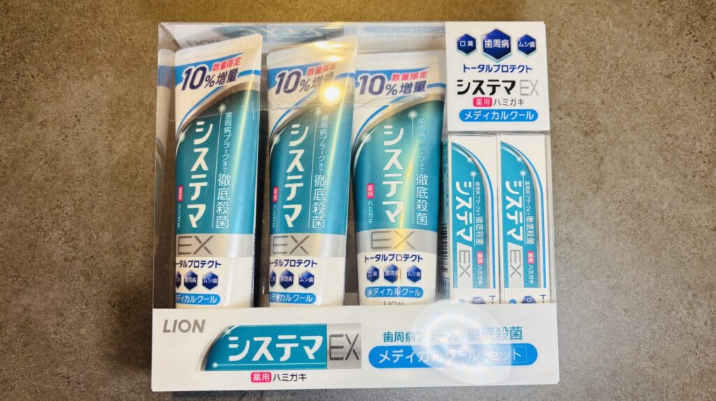 コストコのシステマex歯磨き粉は5本入っており、ドラストで購入するよりもかなり安くなっていました。